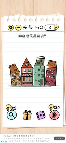 在第50关中,你需要找出哪座建筑最结实,有些建筑外表看起来有裂缝,难道它就是不结实的吗?下面小编就给玩家带来Brain Test第50关怎么过的攻略,一起去看看吧!